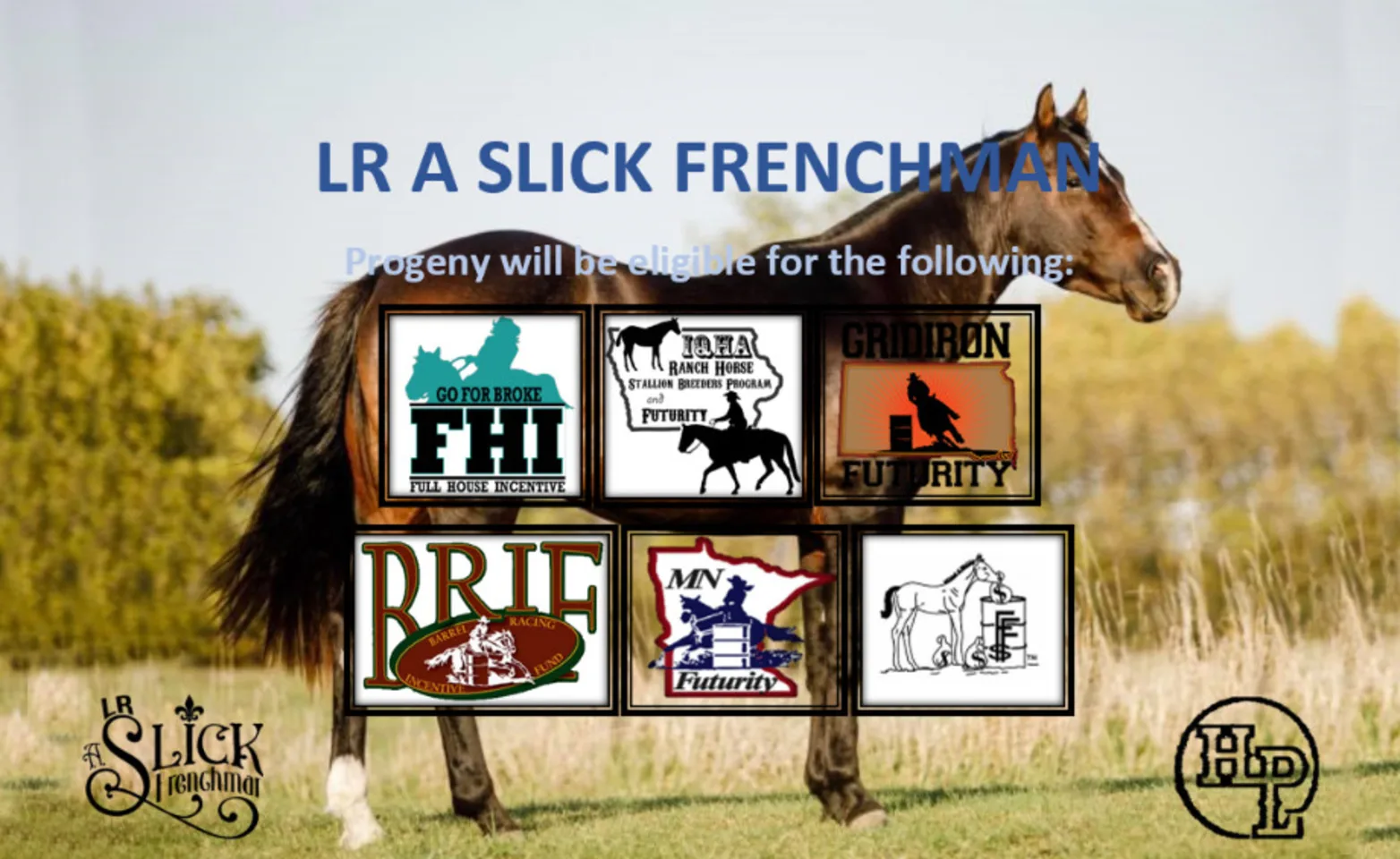 LR A Slick Frenchman (Stitch) is a 2016 bay stallion sired by the million dollar sire Slick By Design who is the #1 Equi-Stat barrel stallion with LTE in excess of $640,000 and All-time leading sire with earners of more than $2 million, Slick By Design was the No. 1 Futurity Sire in 2019 by money won, AND he had more futurity champions than any other stallion! If you are looking for an all-around stallion to produce your next barrel or rope horse, take a look at this up & coming stallion. We are so excited that he will once again be standing at Abrahams Equine Clinic in Cedar Rapids Iowa for the 2022 season.